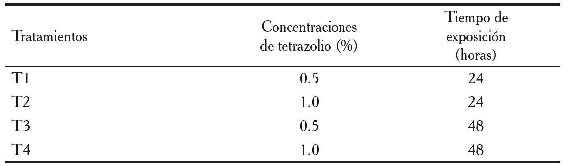 El diseño experimental fue factorial 2 x 2, completamente al azar (dos concentraciones de tetrazolio y dos tiempos de exposición) y 100 semillas con cinco repeticiones. Los datos arrojados en la prueba de tetrazolio se analizaron con ANDEVA, del mismo modo, en la comparación hecha entre el porcentaje de germinación y la prueba de viabilidad con tetrazolio. Posteriormente, las medidas fueron comparadas utilizando la prueba de rangos múltiples de Tukey con el propósito de determinar las diferencias significativas a un nivel de P≤0.05. En la evaluación del análisis estadístico, fue utilizado el software Statgraphic Centurion® versión 17. Para la elaboración de las gráficas se utilizó el software KyploT 2.0.