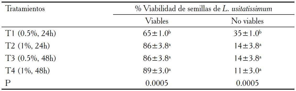 La prueba de germinación ayuda a discriminar entre las semillas que no germinaron por ser latentes, abortadas, o tener embrión dañado (Elizalde et al., 2017). Dicha prueba mostró un 86 % de germinación en promedio para las cinco repeticiones con una desviación estándar de 9.63 (cuadro 3), siendo más bajo en comparación a la viabilidad obtenida en T4 (1 %, 48h) (cuadro 2), encontrándose igualdad con T2 (1 %, 24h) y T3 (0.5 %, 48h), donde la viabilidad fue del 86 % para cada uno (cuadro 4). Resultados similares a los descritos por Zaghdoudi et al. (2015), donde semillas de L. ussitasimum, presentaron un 97 % germinación en condiciones similares a este estudio, siendo conveniente en el ámbito agronómico, ya que se observa una tendencia en los resultados del estudio realizado por Patil et al. (2015) en semillas de L. ussitasimum, donde la germinación fue del 92 % para la variedad NL-97 y de 96 % para la variedad NL-260. Según Nasri et al. (2017), las fluctuaciones de factores como la temperatura influyen en la germinación de las semillas, no obstante, la prueba con tetrazolio, permitió determinar que las semillas analizadas, tenían potencial germinativo, indicando que en promedio el 81.5 % de las semillas de la muestra tenían posibilidad de germinar.