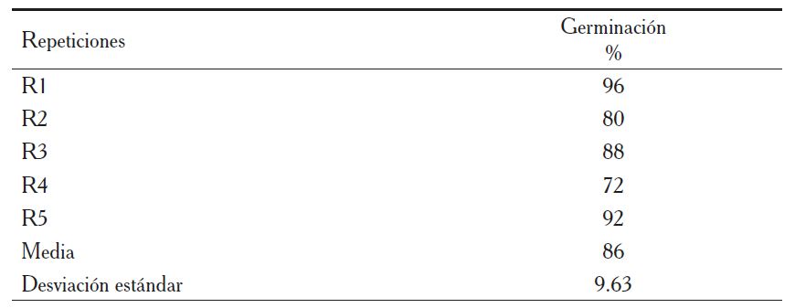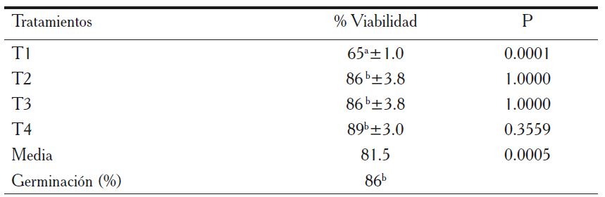 En la prueba de germinación se obtuvo un porcentaje promedio del 86 % en la evaluación del porcentaje de germinación (cuadro 3), valor que concuerda estadísticamente con los porcentajes obtenidos de viabilidad en T2, T3 y T4 (cuadro 4).