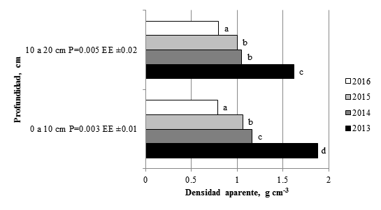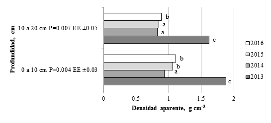Por su parte, el CAS también tuvo en ambas profundidades incrementos marcados (figura 4). La materia orgánica alcanzó en 2015 valores de 5.68% y en 2016 de 4.96% (véase cuadro 2) y la densidad aparente (figura 5) varió positivamente en la profundidad de 0 a 10 cm de 0.19 g cm-3 en 2014 a 0.79 g cm-3 en 2016.