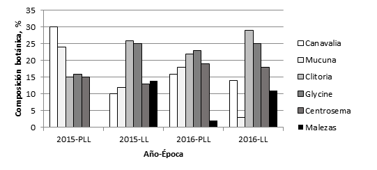 En la figura 1 se muestra el comportamiento de la composición botánica del área a partir de 2015 en el devenido banco de proteína. Se observa que canavalia y mucuna tuvieron mejor comportamiento en época poco lluviosa de ambos años, y sólo predominaron en la seca de 2015, para después decrecer su porcentaje e ir desapareciendo paulatinamente; además se aprecia en la época lluviosa la presencia de malezas en ambos años.