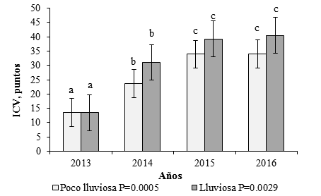 La mejora del ICV (figura 6) estuvo dado, principalmente, por el incremento de la profundidad de la raíz, la disminución de las costras, la mejora de la cobertura del suelo, y al aumento de la materia orgánica.