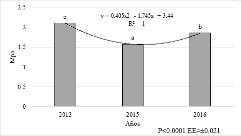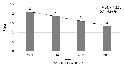 En el suelo de esta área se observó una significativa mejora. Su ICV (figura 2) se recuperó respecto a 2013 en alrededor de 10 puntos para la época poco lluviosa de 2014 (23.6 puntos) y alcanzó condición buena en la lluvia de ese mismo año (33.9 puntos). Posteriormente se observó que mantuvo estabilidad en este índice. La cantidad de lombrices y la cobertura se incrementaron respecto al año base para ambas épocas estacionales (cuadro 1). Mientras, la profundidad de la raíz mejoró respecto al año base, pero entre años posteriores solamente difirió para la época lluviosa (cuadro 1). La resistencia a la penetración mostró una recuperación hacia valores inferiores al valor crítico inicial, que varió de 2.10 Mpa en 2013 a 1.36 Mpa en 2016, lo que significó un decrecimiento en -0.247 Mpa entre el inicio y el fin de la investigación (figura 3).