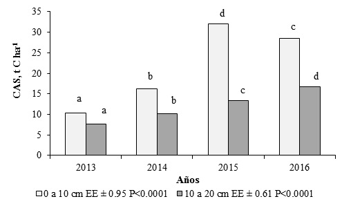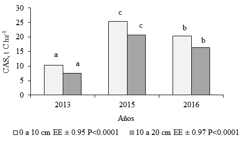 El CAS también debe ser una función de los contenidos de materia orgánica (Giraldo et al., 2006). Fisher et al. (2004) y Amézquita et al. (2006) plantean que 75% del C orgánico del suelo se encuentra entre los 20 y 80 cm de profundidad, por lo que estimaron que de 0 a 30 cm exista 40 t C ha-1, aproximadamente. En el caso de este estudio, los valores en la profundidad de 0 a 20 cm debieron relacionarse con las labores de cultivo y manejo realizadas (laboreo, aplicación de materia orgánica, uso de plantas leguminosas, entre otros) lo que mostró que el tipo de manejo contribuyó a la mejora paulatina de este indicador y a que tendiera a encontrarse en rangos de valores similares a lo que plantean dichos autores, como posibles para estos suelos.