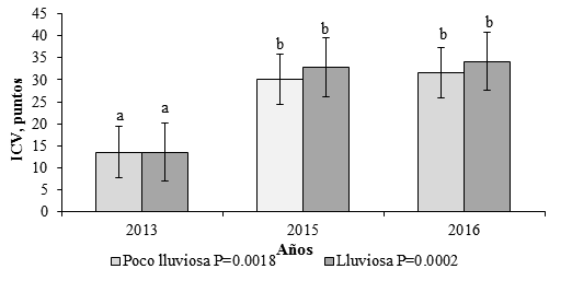 El ICV (figura 6) mejoró significativamente respecto a la línea base. Los indicadores edáficos que se utilizan para su determinación progresaron entre años; así, la profundidad de la raíz y la población de lombrices se incrementaron (cuadro 3); la materia orgánica aumentó (cuadro 4); disminuyeron las costras superficiales y la cobertura del suelo se mantuvo con valores superiores a 95%, sin variar entre momentos de evaluación. Estas condiciones se encontraron durante el segundo año del cultivo, momento en el que también aparecieron algunas malezas, las que se controlaron manualmente. Las raíces, sin embargo, no tuvieron variaciones entre años para cada época, aunque mostraron que el cultivo tiende a extender rápidamente su sistema radical, que alcanza entre 0.55 y 0.67 m de profundidad.