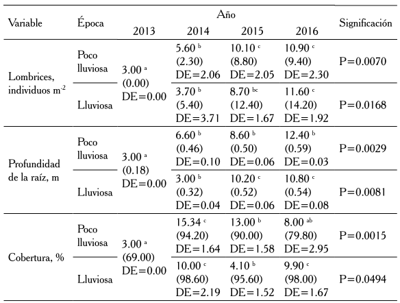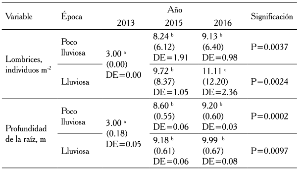 El comportamiento de la profundidad de la raíz, las lombrices y la cobertura en el suelo (cuadro 3) evidenció que el manejo del cultivo tendió a mantener sin variaciones la cantidad de lombrices en la época poco lluviosa, mientras que en la lluviosa se incrementaron, sobre todo porque la hojarasca que acumuló entre cortes hizo que bajo las plantas se creara un colchón de desechos que debió beneficiar la conservación de la humedad del suelo, factor primordial para el crecimiento y desarrollo de estos organismos.