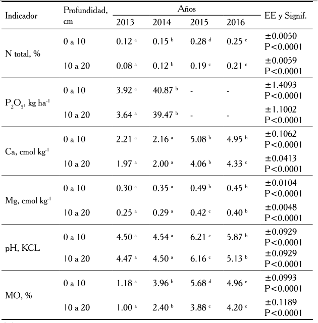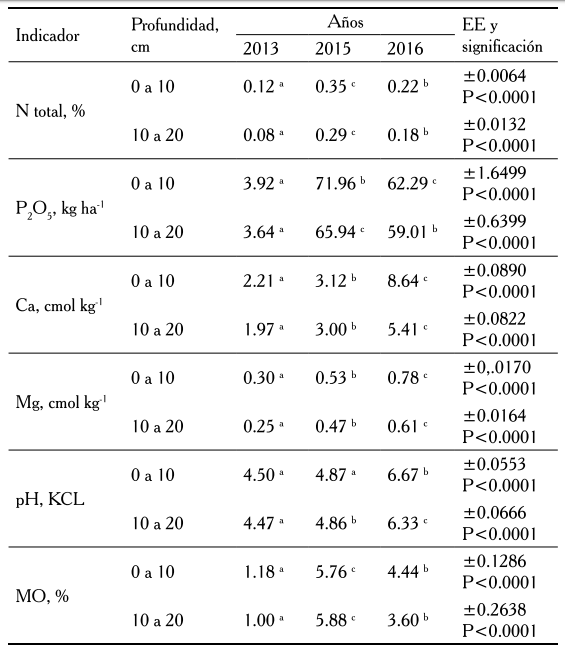 Debido al trabajo con las leguminosas como abonos verdes, la evaluación del efecto en el suelo de las prácticas utilizadas, solamente se efectuó para los años 2015 y 2016.