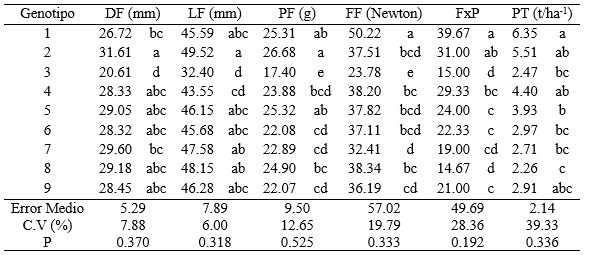 Dónde: DF= diámetro de fruto; LF= longitud de fruto; PF= peso medio de fruto; FF= firmeza del fruto; FxP= frutos por planta; PT= productividad.