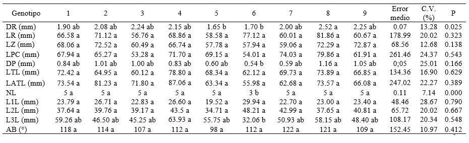 Dónde: DR= diámetro de rama principal; LR= longitud de rama principal; LZ= longitud de zarcillos; LPC= longitud de pecíolo; DP= diámetro de pecíolo; LTL= longitud total de limbo; LATL= longitud de ancho total de limbo; NL= número de lóbulos; L1L= longitud del primer lóbulo en sentido horario; L2L= longitud del segundo lóbulo en sentido horario; L3L= longitud del tercer lóbulo en sentido horario; AB= ángulo de la base.