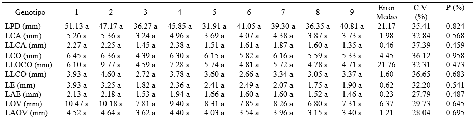 Con relación a los caracteres reproductivos de la flor masculina, solamente se encontró diferencia significativa en la característica longitud de cáliz de 6.62 mm en el genotipo comercial Feltrin® Calcutá liso, comparado con el 5.40 mm en el genotipo regional MAXGU#03, éstos a su vez comparten similitud estadística con el resto de los genotipos, tanto en con los comerciales como también con los regionales, todas las demás características tuvieron valores no significativos (cuadro 3).