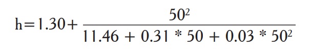 Donde: h= altura; 1.30= constante del modelo; t= edad 50 años; a= 11.46, b= 0.31, c= 0.03 parámetros de regresión del modelo.