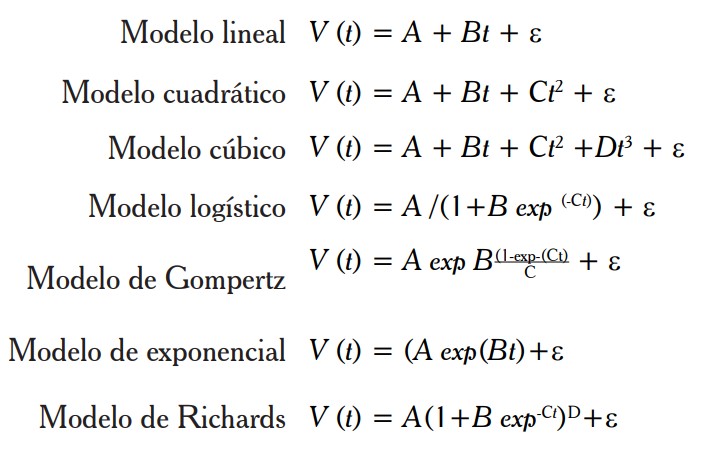 Para realizar el ajuste de los modelos lineales (lineal y cuadrático) se usó el método de los mínimos cuadrados, y para el caso de los modelos no lineales (cúbico, logístico, Gompertz, exponencial y Richards) se utilizó el procedimiento iterativo de estimación de los parámetros de Levenberg-Marquardt, partiendo de una solución inicial de los parámetros, prefijando la convergencia de la suma de cuadrados del error y de los parámetros como 1e-8.