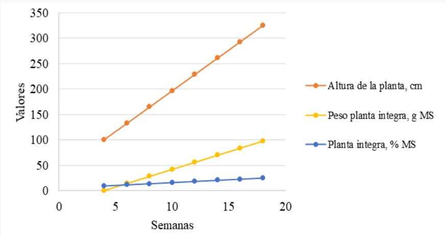 En la figura 1 se aprecia que las variables altura de la planta, peso de planta íntegra y % de MS de la planta íntegra se ajustaron a un modelo lineal e incrementan sus valores desde el inicio del estudio hasta la semana 18 de crecimiento, pero con valores diferentes. La altura de la planta presentó valores iniciales de 100.9 y alcanzó 325.1 cm a las semanas cuatro y 18, respectivamente. Mientras el peso de la planta íntegra tiene 0.7 g MS a las cuatro semanas y 97.9 g MS en la semana 18. El % de MS de la planta se incrementó desde 9.3 hasta 25.4 % con cuatro y 18 semanas, respectivamente.