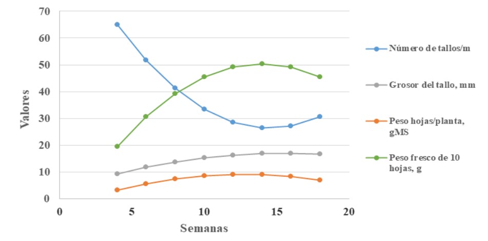 Al integrar la información se puede caracterizar este material vegetal de crecimiento adecuado para evaluar en estudios futuros la producción de forraje en sistemas de corte o en pastoreo, al conocerse el comportamiento de diferentes componentes de la planta en el tiempo, y que sea utilizado de forma correcta, según la productividad que se desee.