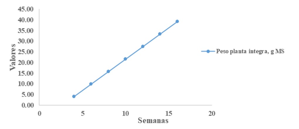 El cuadro 5, con información de los parámetros del modelo lineal, muestra que el crecimiento promedio de cada semana fue de 0.01 kg para rendimiento MS y de 2.92 g en el peso seco de la planta íntegra y en los indicadores de dispersión alcanzó un valor no adecuado para esta última variable. Respecto a la variable peso de la planta íntegra alcanzo valor de 4.08 g en la semana cuatro y se incrementó hasta 39.12 g a las 16 semanas (figura 3). Mientras que en el cuadro 6 se aprecia que los valores de dispersión fueron adecuados.