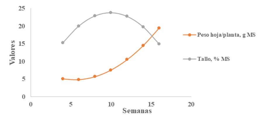 Para el peso de la hoja los resultados fueron semejantes en las semanas cuatro y seis (5.0 - 4.9 g) y es a partir de este momento que incrementan sus valores hasta llegar a la semana 16 con 19.46 g (figura 4). El contenido de MS del tallo en la semana cuatro es de 15 % y fue aumentando de forma progresiva hasta llegar en la semana 10 a 23.7 % y a partir de este momento bajó ligeramente en la semana 12 (22 %) y continúo bajando en el tiempo.
