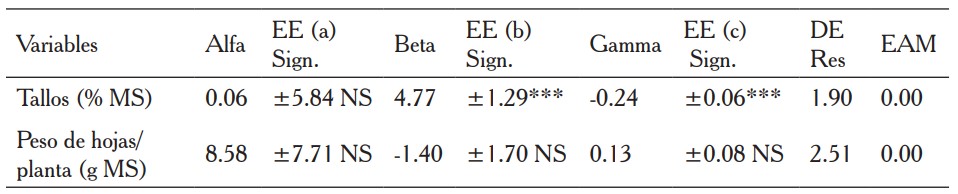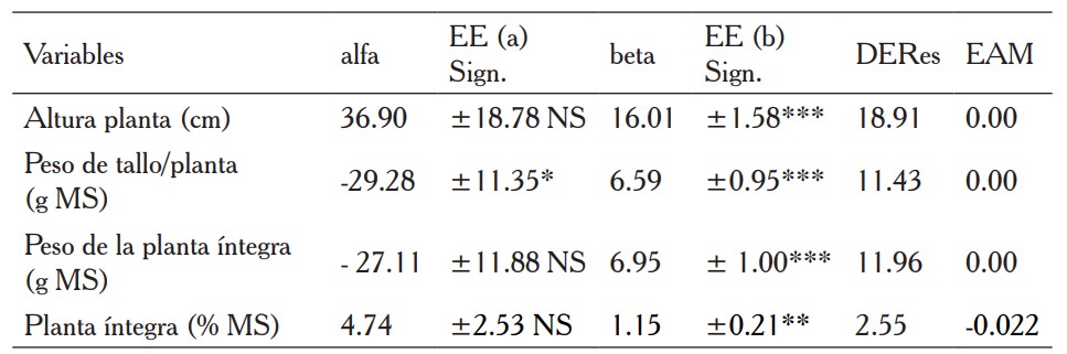 En el cuadro 2 se puede observar el crecimiento promedio cada semana para las variables que mejor se ajustaron a este modelo, como son altura de la planta (16.01 cm), peso del tallo/planta (6.59 g MS), peso de la planta íntegra (6.95 g MS) y % MS de la planta íntegra (1.15 %). Los valores alcanzados para EAM son correctos, mientras que para el error estándar de residuos (DERes) son altos para las variables en estudio.