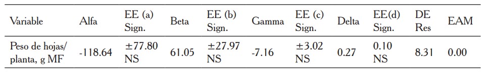 El modelo cúbico se ajustó para el peso de hojas/planta MF en la estación seca.