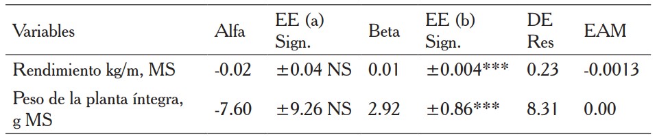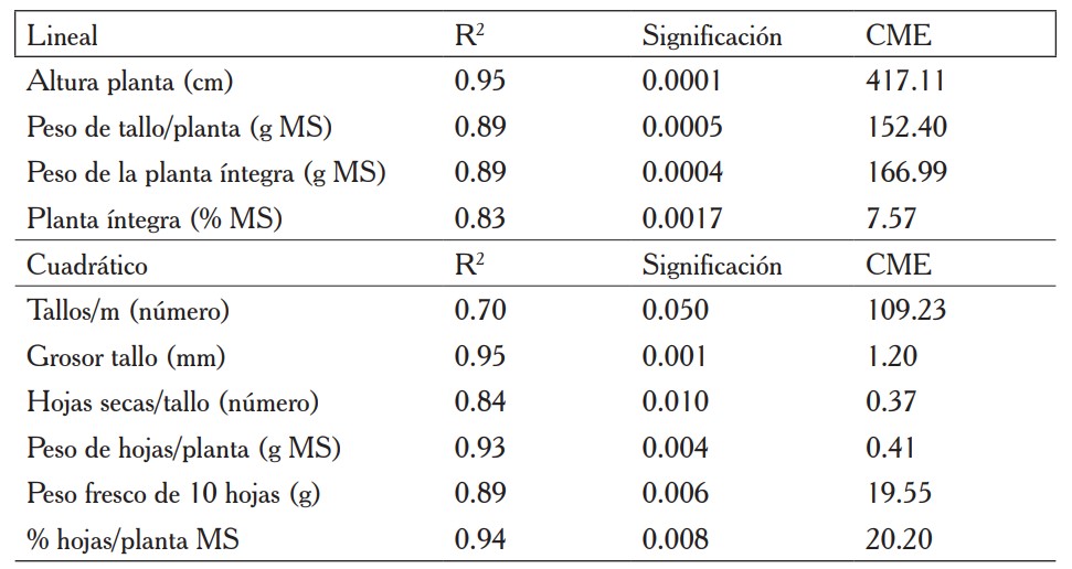 El modelo lineal en la estación lluviosa se ajustó a la altura de la planta, peso de la planta íntegra y peso del tallo/planta, así como % de materia seca de la planta íntegra. En la estación seca sólo lo hizo para el peso de la planta íntegra y rendimiento.