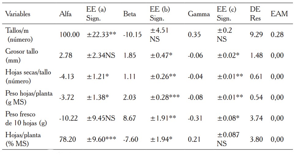 El modelo cuadrático en la estación lluviosa se ajustó a número y grosor del tallo, número de hojas secas/planta y peso seco de hojas/planta, así como % de hojas/planta y peso fresco de 10 hojas. En la estación seca lo hizo para peso de hojas/planta y % de materia seca de tallo.