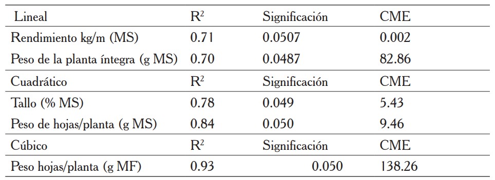 En el material vegetal O-23 se aprecia que sólo la variable número de tallos/m (modelo cuadrático) tiene R2 de 0.70 y su significación de 0.05, aunque adecuada (cuadro 1), el resto de variables tiene una R2 superior a 0.80 y alta significancia.