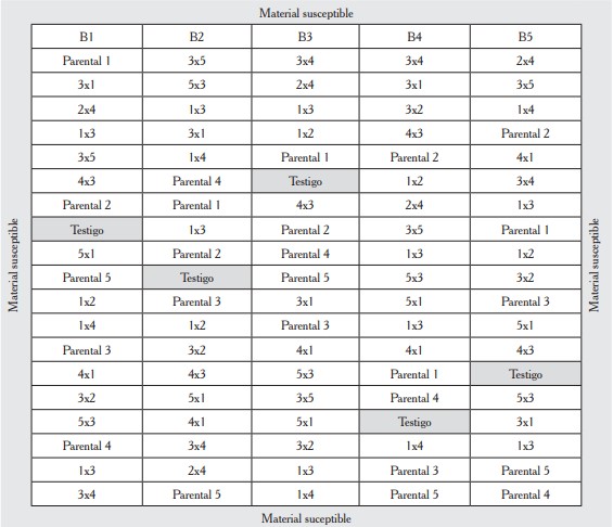 Los tratamientos se distribuyeron en un diseño de bloques completos al azar. Cada tratamiento tuvo cinco repeticiones y cada repetición estuvo constituida por una planta. La distancia entre plantas fue de 0.2 m y entre bloques de 0.2 m. Cada uno de los surcos se numeró de izquierda a derecha, al finalizar cada bloque se continuó la numeración con el surco más próximo del siguiente bloque. Se sembró una variedad susceptible a P. oryzae (Palmar-18) alrededor de la parcela, para evitar el efecto borde sobre las unidades experimentales y predisponer a los genotipos a infectarse mediante la técnica de camas de infestación.