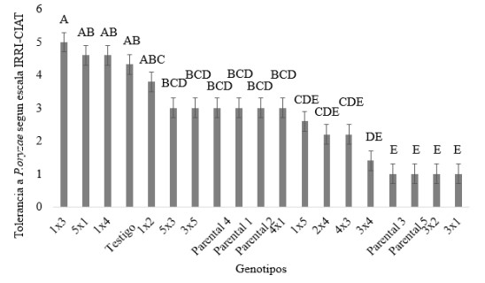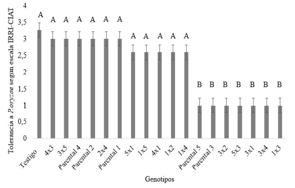 Para la variable tolerancia a P. oryzae a los 20 ddg, las combinaciones 1x3, 3x4, 3x1, 5x3, 3x2 y los parentales 5 y 3 presentaron diferencias significativas (p<0.05) con los restantes cruzamientos, parentales y testigo del estudio. Cabe destacar que, para esta variable, los valores menores corresponden a mayor tolerancia a la enfermedad P. oryzae. Por otro lado, el testigo utilizado para determinar la incidencia de la enfermedad presentó el nivel más bajo de tolerancia para la enfermedad indicada, es decir la más susceptible (figura 2).