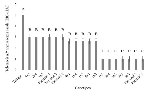 Según el análisis de HCE y HM, los cruces 3x1, 3x2 y 3x4 presentaron el mejor comportamiento para las diferentes variables agronómicas medidas, incluyendo su tolerancia a P. oryzae, por ello los siguientes estudios se deben centrar en las hibridaciones indicadas.