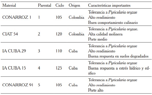 El germoplasma utilizado en el estudio es propiedad de la Corporación Arrocera Nacional y provienen de convenios internacionales con la Empresa Cubana Exportadora y Comercializadora de Productos de la Ciencia y la Técnica Agropecuaria (CATEC, Cuba) y con el Centro Internacional de Agricultura Tropical (CIAT, Colombia). Los materiales utilizados corresponden a hibridaciones provenientes de parentales seleccionados por el área de mejoramiento genético de CONARROZ (cuadro 1).