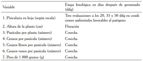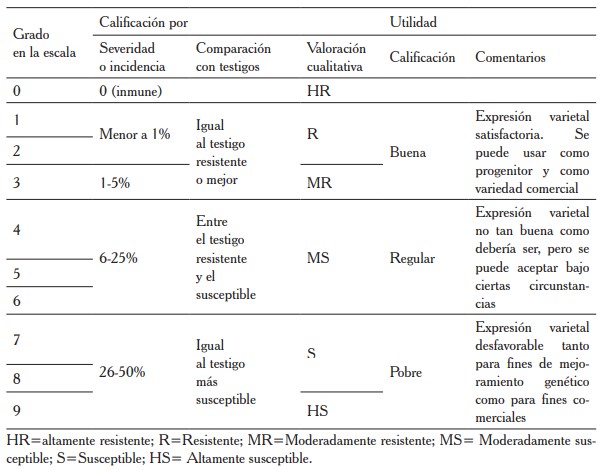 Para las siete variables cuantificadas se utilizó el sistema de evaluación estándar del International Rice Research Institute en Filipinas (IRRI, 2013) adaptada por el CIAT. Según el protocolo mencionado, se utilizó una escala general con valores de 0-9, donde cero indica la inmunidad del material contra P. oryzae y nueve altas susceptibilidades (cuadro 2).
