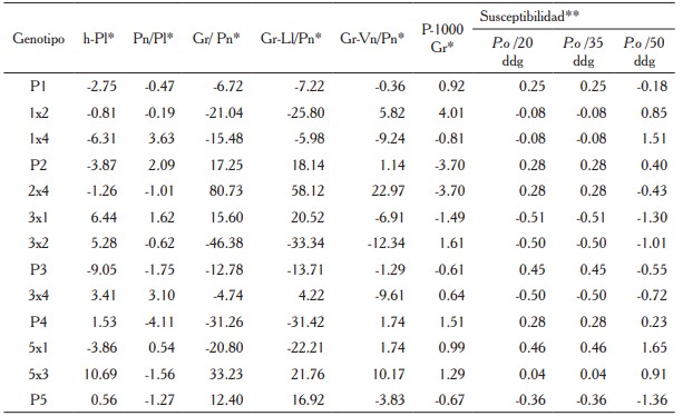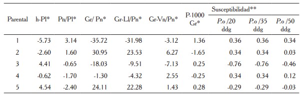 Para las variables más importantes P.o/20 ddg, P.o/35 ddg y P.o/50 ddg, los parentales 3 y 5 presentaron los valores más negativos; sin embargo, en esta variable quiere decir que fueron los que se mantuvieron más sanos.