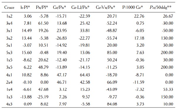 En el cuadro 5 se presentan los valores correspondientes a la habilidad combinatoria específica (HCE). Los valores individuales por cada cruzamiento específico para cada variable medida representan los efectos no aditivos. Se presentaron valores significativos con respecto a la media para todas las variables medidas (p<0.05). Para la variable h-Pl los cruzamientos con mayor valor fueron 5x3, 3x1, 3x2 y 3x4. Para la variable Pn/Pl, los cruces 1x4, 3x1 y 3x4 mostraron un buen comportamiento para esta característica, al presentar alta HCE. Los cruces 2x4 y 5x3 presentaron los valores superiores para HCE en Gr/ Pn. Las combinaciones de parentales que presentaron los valores superiores de HCE para Gr-Ll/Pn, fueron 2x4, 3x1 y 5x3, esta variable es deseable para seleccionar genotipos superiores.