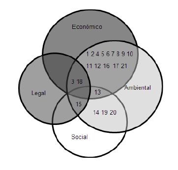 A fim de se ilustrar as intersecções das quatro dimensões, posicionando-se as práticas identificadas nos três casos, desenvolveu-se um diagrama de Venn (Figura 2). Destaca-se que este diagrama utilizando quatro elementos não possibilita o posicionamento de práticas com as seguintes combinações: intersecção apenas entre as dimensões legal e ambiental ou entre as dimensões econômica e social; porém, tal restrição não inviabilizou a análise da ilustração, uma vez que as práticas identificadas nos casos analisados não ocorreram nas referidas situações. É válido observar que, embora os motivos que influenciam a adoção da TI Verde possam ser categorizados (Molla & Abareshi, 2012), conforme apresentado no referencial teórico, a análise dos casos revelou que as práticas nem sempre estão associadas a uma única categoria de motivação. Em certos casos, implanta-se uma prática visando à sustentabilidade em consequência de pressões, tanto externas como internas, bem como de interesses que mesclam objetivos econômicos, ambientais, sociais e legais, tornando o diagrama de Venn uma ferramenta apropriada para demonstrar o posicionamento das práticas nas intersecções estabelecidas.