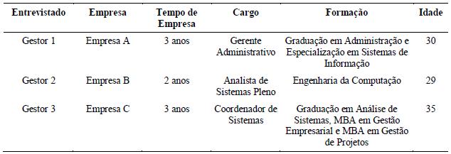 O primeiro contato com estas três empresas se deu por e-mail, através de uma manifestação de interesse na realização de entrevistas com seus respectivos gestores da área de TI, bem como o encaminhamento da apresentação da proposta de pesquisa. Após o retorno dos e-mails e agendamento prévio com os gestores, procedeu-se à etapa de coleta de dados. As entrevistas foram realizadas pessoalmente nas sedes administrativas das empresas e tiveram duração aproximada de uma hora, sendo registradas por meio de gravação de áudio e, em seguida, transcritas. Adicionalmente, foram aplicados métodos secundários de coleta de dados, que consistiram em observação do ambiente da empresa para conhecimento de equipamentos, e consulta ao site corporativo e a documentos das empresas para complementar as informações cedidas nas entrevistas pelos gestores. A Tabela 1 apresenta o perfil dos entrevistados quando da coleta de dados.