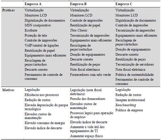 Após o relato dos três casos, apresenta-se uma síntese dos resultados na Tabela 2. Os resultados indicam que as principais práticas de TI Verde envolvem: controle de recursos, terceirização de servidores e impressoras, virtualização, substituição de equipamentos, coleta seletiva e descarte correto. Além disso, revelam que apesar de alguns desses investimentos serem altos, apresentam um retorno financeiro rápido, especialmente se mensurada a economia de recursos potencializada às organizações (incluindo-se a possibilidade de multas e penalidades cobradas pelo não cumprimento de exigências legais associadas a essas questões).