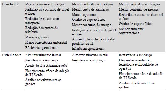 “A gente não considerou difícil implementar a mudança com as impressoras, mas a parte dos servidores e dos thin clients, sim. A grande dificuldade que eu vi foi da parte das pessoas. Tinha uma resistência: alguns tinham o hábito da CPU, de arquivos, de mídias, acesso à internet que antes era liberado e agora não é mais. As pessoas não querem aprender o sistema novo para não perder os hábitos. Tivemos um investimento muito alto em servidores, na parte de rede, mas fomos facilmente convencidos porque a gente tinha a dificuldade da estrutura. Então a gente tinha uma dificuldade operacional e um problema de custo ao mesmo tempo. Notamos benefícios com a utilização dessas práticas, mas não mensuramos os resultados” (Gestor 2).