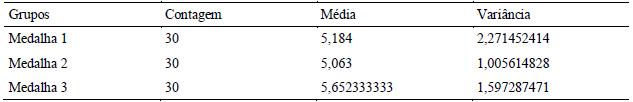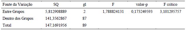 Pôde-se perceber que as médias para os três grupos parecem muito próximas, o que gerou indícios de que não seriam encontradas evidências da diferença entre elas. Por fim, a Tabela 6 apresenta os resultados obtidos a partir do teste ANOVA.