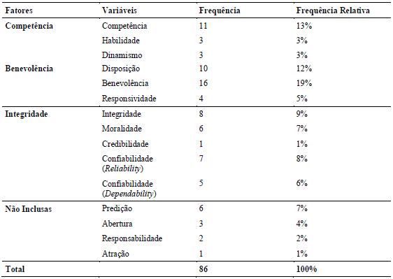 Diversas pesquisas investem na criação de esquemas e mecanismos que facilitem a identificação dos fatores que levam clientes a adquirir confiança em relação a uma determinada empresa, no âmbito do comércio eletrônico (McKnight, Choudhury, & Kacmar, 2002). De fato, a própria definição de confiança apresenta versões variadas, que estão relacionadas a diferentes ontologias (Butler, 1991; Rempel, Holmes, & Zanna, 1985; Rotter, 1971): do ponto de vista da psicologia, confiança é definida como uma tendência de confiar em outros indivíduos; do ponto de vista da psicologia social, confiança é definida como uma cognição acerca da entidade em questão; já do ponto de vista da sociologia, confiança é entendida como uma característica do ambiente institucional. Por conta das diferentes caracterizações de confiança, outras pesquisas passaram a abordar o conceito como um fator multivariado, que sofre influência de diversos aspectos, conforme ilustrado no levantamento realizado por McKnight, Choudhury e Kacmar (2002), Tabela 1.