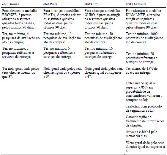 Os selos consolidados que são aferidos às lojas virtuais do sistema de reputação da eBIT são entregues conforme o atendimento de alguns critérios, incluindo a média geral das avaliações realizadas por consumidores. A Tabela 2 apresenta os critérios utilizados para entrega de selos.
