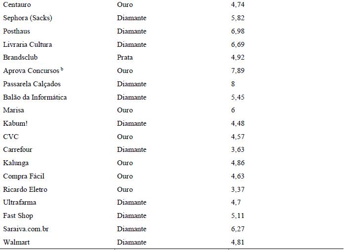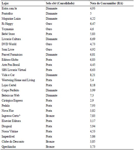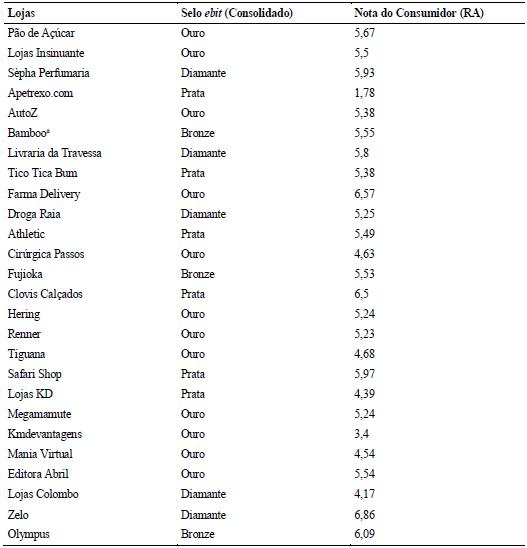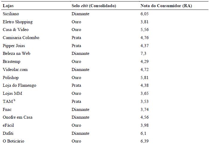 Inicialmente, buscou-se identificar lojas virtuais conveniadas e avaliadas pelo sistema de reputação eBIT que também possuíssem índices/avaliações no sistema de reputação do site Reclame Aqui para composição de uma amostra que viabilizasse a realização dos testes para análise da coerência entre os sistemas de reputação. Como ponto de início, foi utilizada a lista das 100 empresas(1) eleitas como as mais queridas do sistema eBIT, em 2011. Essa lista é composta a partir do voto popular dos consumidores, anualmente, e faz parte dos resultados do Prêmio E-bit Melhores lojas do E-commerce (Ebit Empresa, n.d.). Nela, constam a posição, o nome da loja e o selo eBIT das empresas.