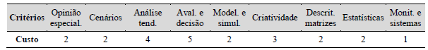 A partir da análise das famílias, foram atribuídas as seguintes notas neste critério, apresentadas na Tabela 1: as técnicas de monitoramento e sistemas receberam a menor nota (1) por serem as que apresentam maiores custos; as técnicas de avaliação e decisão receberam a maior nota (5) por serem as de menores custos; em seguida, análise de tendências recebeu nota 4; criatividade, nota 3; as demais famílias receberam nota 2.