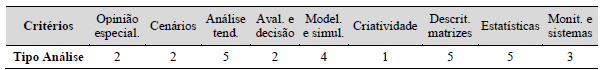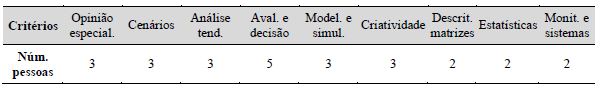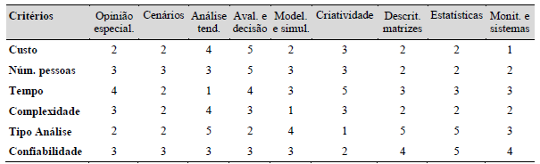 A partir da análise das famílias, foram atribuídas as seguintes notas neste critério, apresentadas na Tabela 2: as técnicas de avaliação e decisão receberam a maior nota (5) por serem as que necessitam de menos pessoas; em seguida, análise de tendências, cenários, modelagem e simulação, opinião de especialistas e criatividade receberam nota 3; as demais famílias receberam nota 2.