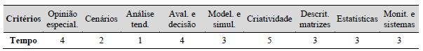 A partir da análise das técnicas, foram atribuídas as seguintes notas neste critério, apresentadas na Tabela 3: as técnicas de criatividade receberam nota 5 por serem as que apresentam, relativamente às outras, menor tempo; as famílias de avaliação e decisão e opinião de especialistas receberam nota 4; as de monitoramento e sistemas, modelagem e simulação, descritivas e matrizes e estatísticas, nota 3; as técnicas de cenários receberam nota 2; as de análise de tendências receberam a menor nota (1), por serem as mais demoradas.