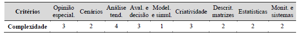 A partir da análise das famílias, foram atribuídas as seguintes notas neste critério, apresentadas na Tabela 4: as técnicas de análise de tendências, apesar de apresentarem alguma complexidade, receberam nota 4 por serem mais simples quando comparadas às outras famílias; em seguida, criatividade, opinião de especialistas e avaliação e decisão receberam notas 3; as técnicas de modelagem e simulação receberam as menores notas (1) devido à sua maior complexidade; as demais famílias receberam nota 2.