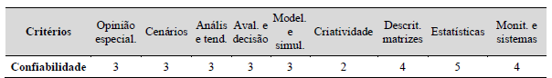 No critério tipo de análise (subjetiva ou objetiva), as famílias das técnicas estatísticas, descritivas e matrizes e análise de tendências são as mais objetivas, enquanto a família criatividade é a mais subjetiva. Por fim, em confiabilidade dos resultados, a família das técnicas estatísticas é a mais confiável, seguida pelas famílias descritivas e matrizes e monitoramento e sistemas. As demais são semelhantes em termos de confiabilidade.