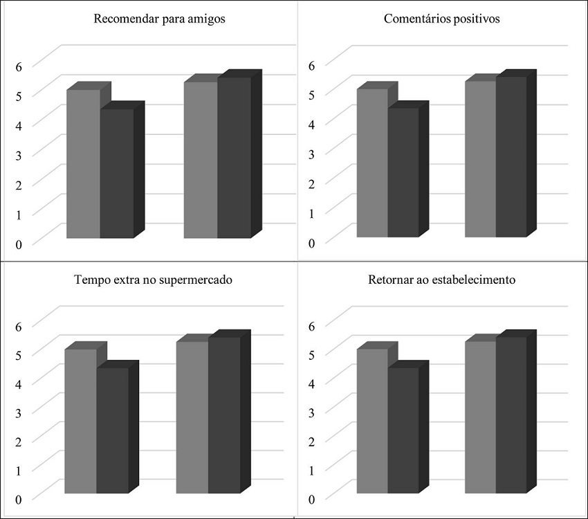 O teste t de student de comparação entre médias mostrou uma diferença significativa entre os grupos da música ao vivo (n = 113) e da ausência de música (n = 102) sobre os aspectos positivos (Mmúsica_vivo = 5,53, Mausência = 5,05; t(213) = 4,294, p < 0,01), sobre os aspectos negativos (Mmúsica_vivo = 2,72, Mausência = 2,49; t(213) = 2,352, p < 0,05), sobre a intenção de recomendar para os amigos (Mmúsica_vivo = 5,14, Mausência = 4,79; t(213) = 3,318, p < 0,01), sobre a intenção de fazer os comentários positivos do supermercado (Mmúsica_vivo = 5,32, Mausência = 4,68; t(213) = 4,440, p < 0,01), sobre o comportamento de gastar mais tempo para explorar o supermercado (Mmúsica_vivo = 4,66, Mausência = 3,59; t(213) = 5,418, p < 0,01), sobre o comportamento de gastar mais dinheiro (Mmúsica_vivo = 4,64, Mausência = 3,66; t(213) = 4,966, p < 0,01), sobre a intenção de retornar ao estabelecimento (Mmúsica_vivo = 5,21, Mausência = 4,84; t(213) = 2,910, p < 0,05), e, por fim, sobre a avaliação da qualidade estética do ambiente (Mmúsica_vivo = 4,94, Mausência = 4,68; t(213) = 2,214, p < 0,05).