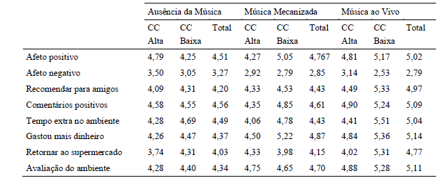Uma ANOVA 3 (música: música ao vivo vs. música mecanizada vs. ausência de música) x 2 (concentração com a compra: baixa vs. alta) mostrou o efeito principal, bem como de interação da música ao vivo e do grau de concentração com a atividade de compra sobre os construtos dependentes. Os resultados mostraram um efeito significativo (p < 0,05) e fornecem suporte para todas as hipóteses em que os ambientes de varejo com música ao vivo teriam melhores avaliações nas respostas dos consumidores sobre os aspectos afetivos (positivos e negativos), as intenções de comportamento e a avaliação da qualidade estética do ambiente, quando comparado com o grupo de música mecanizada ou com ausência de música. As médias das respostas dos consumidores para os grupos com música ao vivo, mecanizada e com ausência de música, além dos grupos com alta e baixa concentração com a compra, podem ser conferidas na Tabela 1.