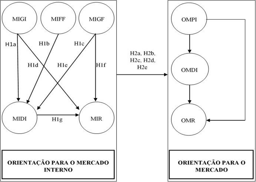Consequentemente, espera-se que a orientação para o mercado interno tenha um impacto positivo sobre a dimensão da capacidade de resposta da orientação para o mercado (Caruana & Calleya, 1998; Gounaris et al., 2010; Lings & Greenley, 2009, 20, 2010; Naude, Desai, & Murphy, 2003; Piercy, 1995; Zaman et al., 2012). Assim, propõem-se as seguintes hipóteses quanto ao inter-relacionamento entre os conceitos de orientação para o mercado interno e orientação para o mercado: