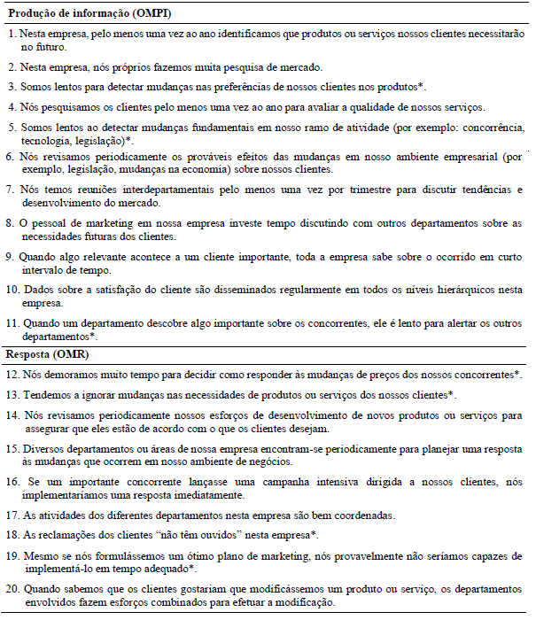 Em relação à orientação para o mercado, foram propostas várias escalas para medir o construto. Como nos focamos na perspectiva comportamental da orientação para o mercado, a escala utilizada neste estudo é a MARKOR (Kohli, Jaworski, & Kumar, 1993). Esta escala identifica o grau em que uma organização realiza atividades de produção de informação no que tange a todos os seus departamentos, a maneira como esta informação é disseminada vertical e horizontalmente e a forma como desenvolve e implementa os programas de marketing interno e externo com base na informação gerada, ou seja, a resposta ao mercado. A escala MARKOR é constituída por vinte variáveis (Tabela 1), alocadas em três dimensões: produção de informação de mercado (OMPI); divulgação da informação de mercado (OMDI); e resposta ao mercado (OMR). Salienta-se ainda que uma versão em português desta escala já foi validada no Brasil por Sampaio (2000).