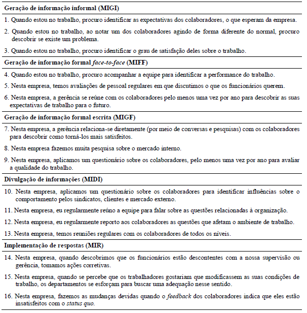 Relativamente ao construto orientação para o mercado interno, será usada a escala desenvolvida por Lings e Greenley (2005). Esta escala inclui dezesseis itens referentes a cinco dimensões da orientação para o mercado interno: três dimensões referentes à geração de informações sobre o mercado interno (Geração de informação informal - MIGI, Geração de informação formal face-to-face - MIFF, e Geração de informação formal escrita - MIGF), divulgação de informações (MIDI) e implementação de respostas (MIR). A Tabela 2 lista os itens que constituem a escala.